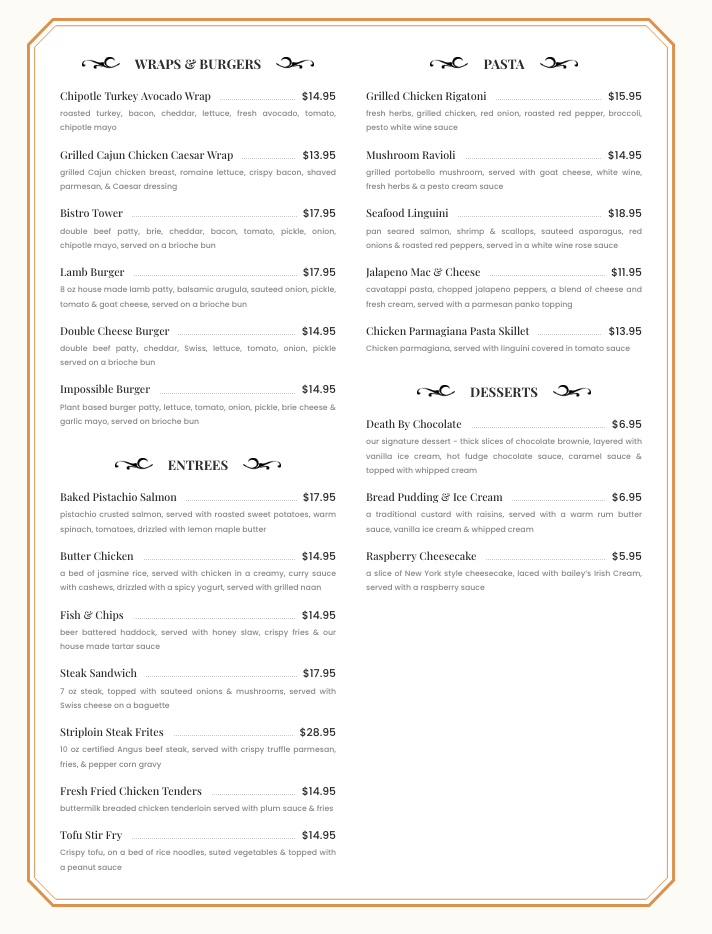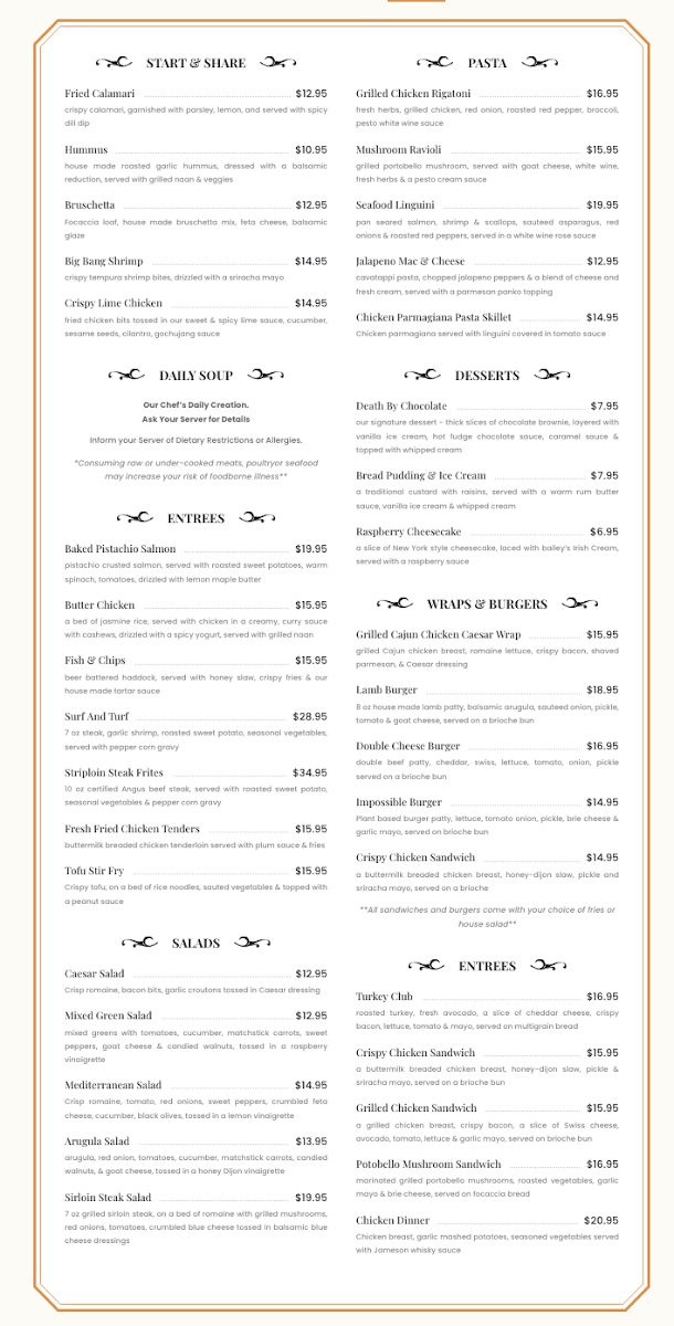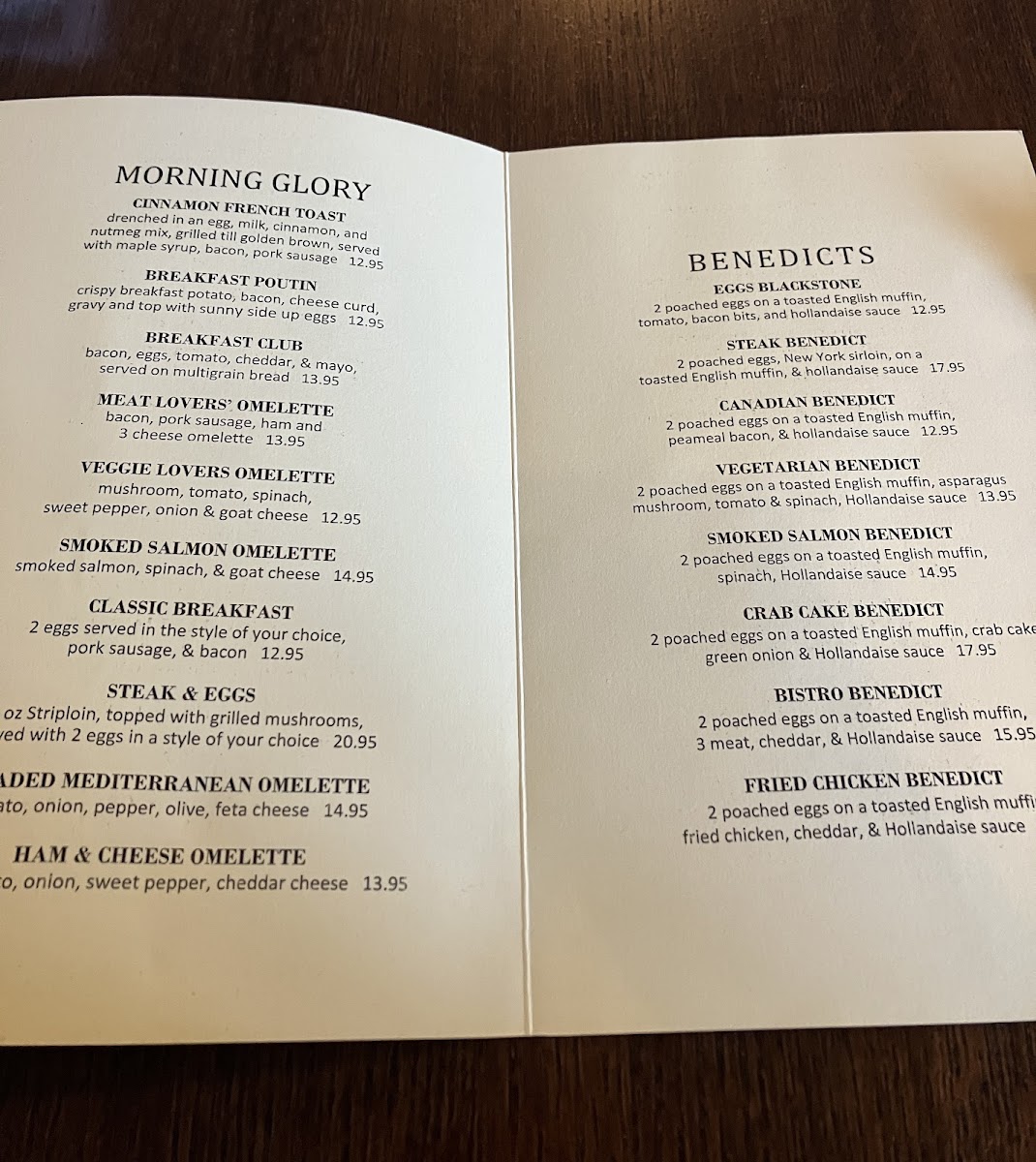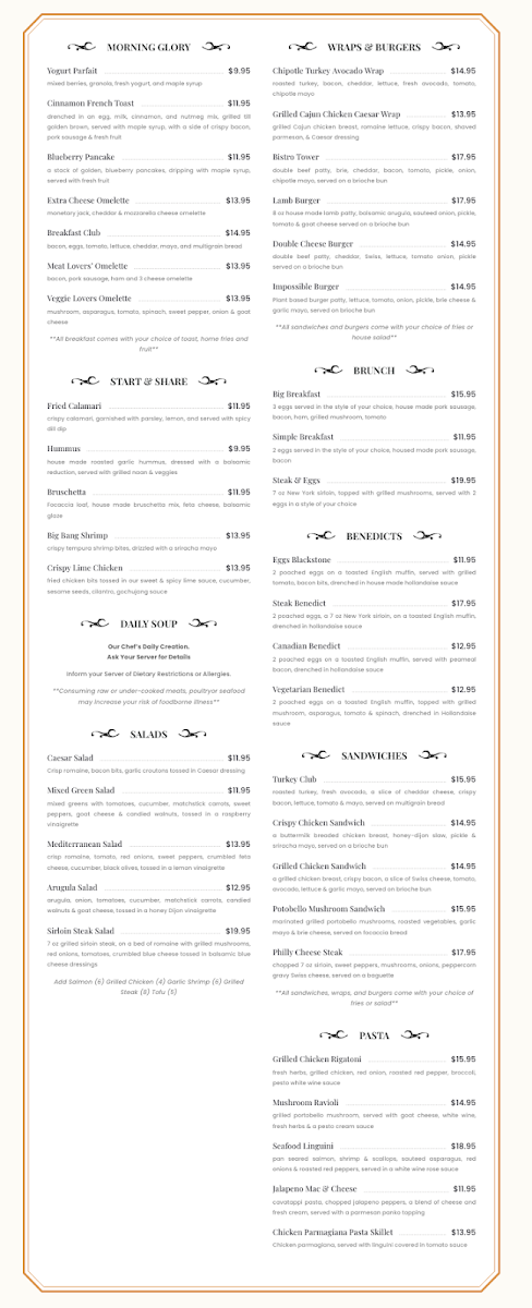 The lunch and dinner menus offer a variety of delectable Sandwiches and Burgers that are just as enticing. Treat yourself to the flavor-packed Turkey Club, combining roasted turkey with fresh avocado and crispy bacon, all served on multigrain bread for CA$18.95. Alternatively, the Blue Cheese Bacon Burger, featuring an 8oz beef patty topped with crispy bacon and blue cheese, will have you savoring every bite for CA$18.95. And let’s not forget the Breakfast Burger, a perfect fusion of breakfast and lunch that’s sure to delight at any hour for CA$21.95.